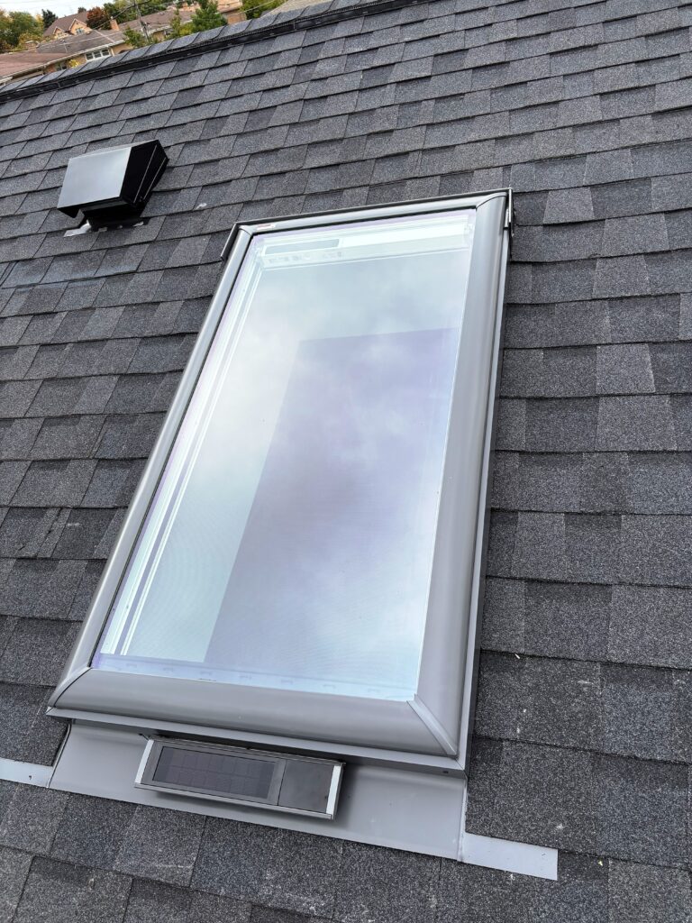 - Skylights: Removed and installed four (4) new skylights matching the same dimensions of the old skylights. Two (2) of the skylights were venting VCS Solar Fresh Air with Rain Sensors and solar powered shades. These skylights included insect screens to prevent bugs and debris from entering the home. The other two (2) skylights were fixed and also included solar powered shades. All of the skylights had new VELUX flashing and came with a remote control for ease of use.